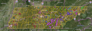 The map reflects locations where “Class B” biosolids are applied to farms and open lands in Tennessee. “Class A” biosolids can be applied anywhere and are not tracked.