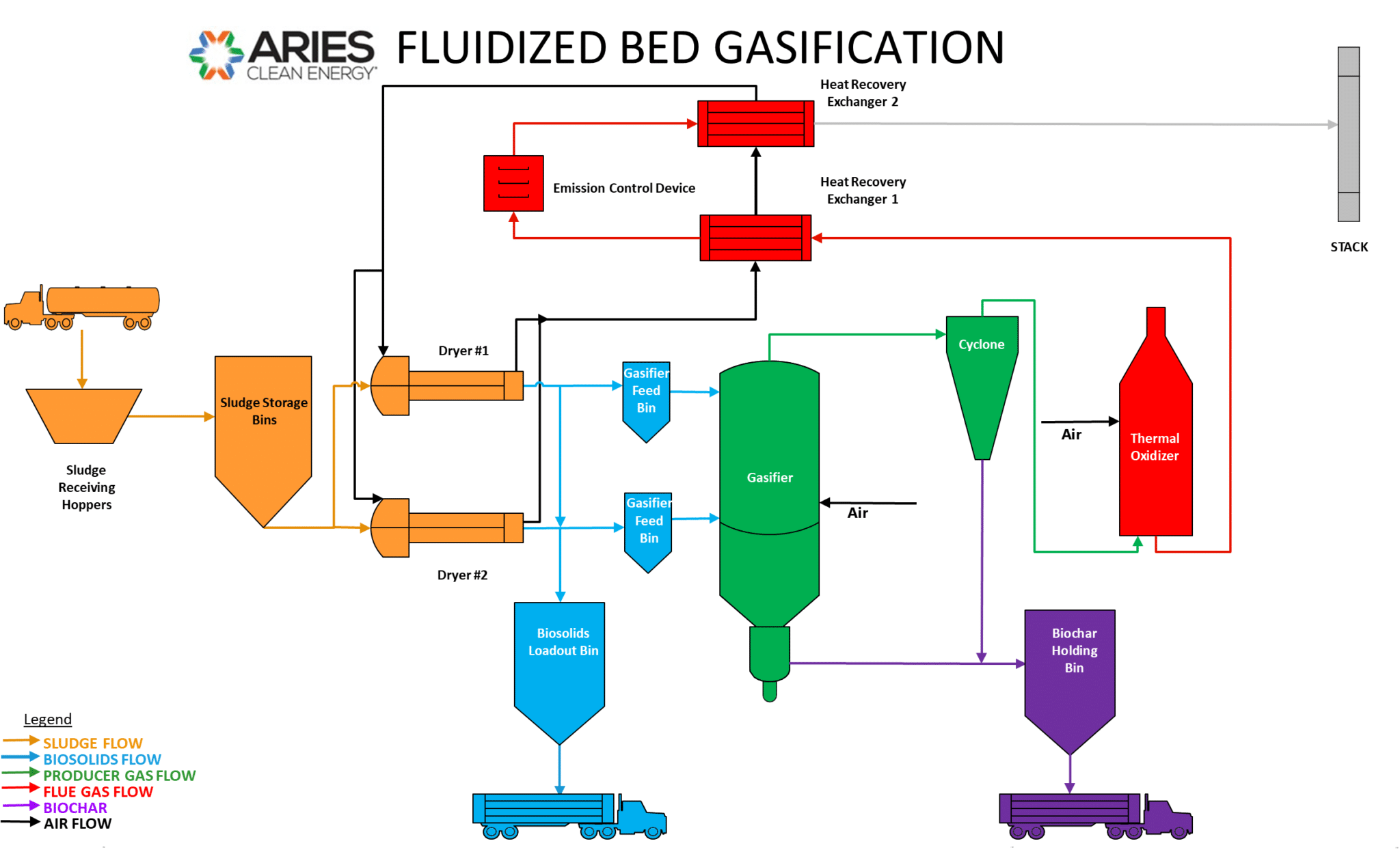 Aries has two separate patented gasification technologies that have applications in the reduction of PFAS. For waste water sludge, the primary technology would be the Aries fluid bed gasifier. This is an atmospheric, bubbling bed, air blown gasifier sized to gasify nominally 100 tons/day of dried sludge or other suitable fuels. For waste water sludge, the gasifier operates at approximately 1250 °F in the fluid bed section of the gasifier.